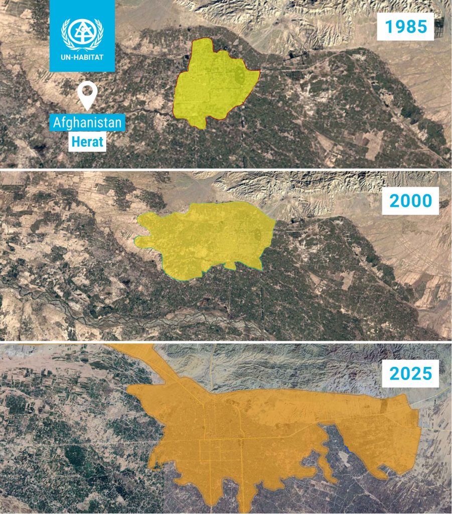 براساس تصویری که «یوان هبیتات» منتشر کرده، وسعت شهر هرات طی چهار دهه اخیر حدود چهار برابر شده است.