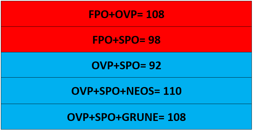حالا با توجه به تعداد کرسیهایشان پنج گزینه برای ائتلاف وجود دارد که باید یک ائتلاف حداقل ۹۲ کرسی از ۱۸۳ کرسی پارلمان را در اختیار داشته باشد.