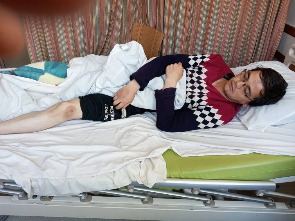 تصاویری که با اکسوس به اشتراک گذاشته شده، نشان میدهد که این آموزگار با زخمهایی بر پای چپ و دست راستش روی بستر شفاخانه دراز کشیده است.