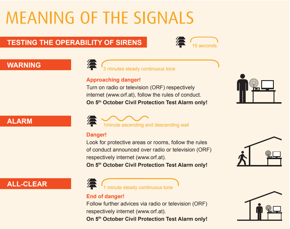 ساعت ۱۲:۰۰ ظهر شنبه، ۵ اکتوبر نخستین زنگ هشدار به مدت ۱۵ ثانیه جهت آزمایش سیستم‌های هشداردهنده در سراسر اتریش به صدا درمی‌آید.
