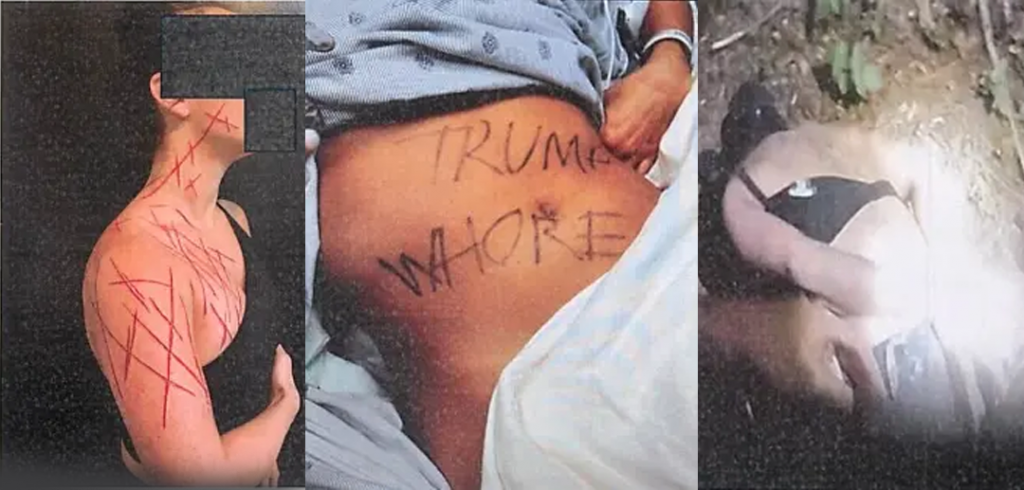 همچنین روی شکم این زن نوشته بود: «فاحشه ترامپ»، «وندرو فاشیست است.»