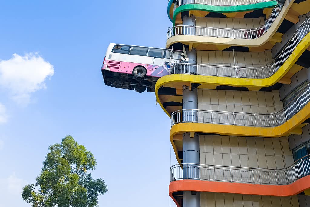 اتوبوس سفید و صورتی رنگ به گونه‌ای به نظر می‌رسد که گویا پرواز و به طبقه هشتم یک ساختمان برخورد کرده است.