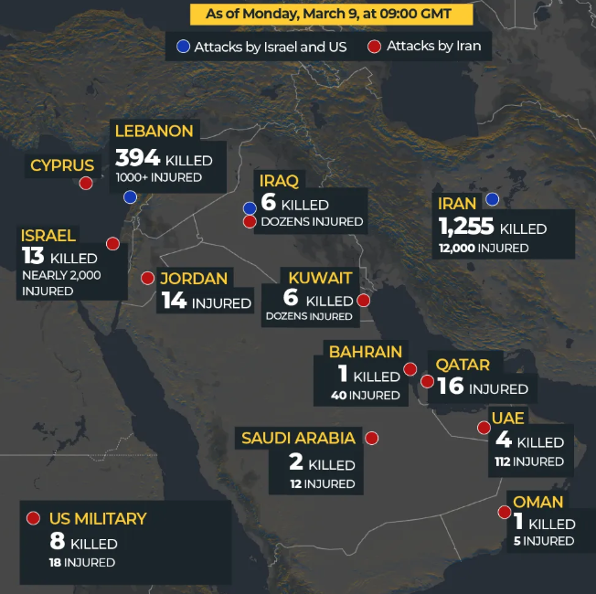 براساس گزارشهای رسمی، تا هنوز در اثر حملات امریکا و اسرائيل بر ایران، یک هزار و ۲۵۵ نفر کشته و ۱۲ هزار نفر زخمی شدهاند.